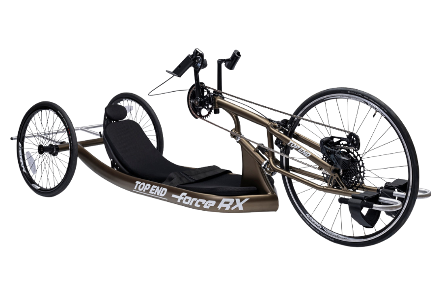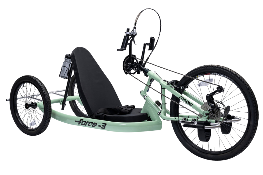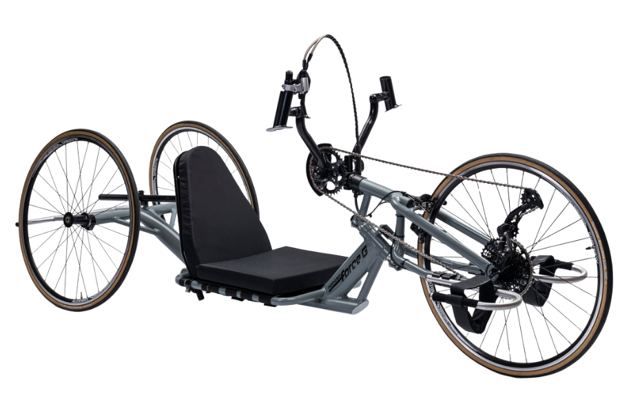 The Force 3 handcycle provides an easy and accessible way to enter the sport of handcycling! Unlike other models, the Force 3 has many standard options to suit the needs of a variety of athletes. The handcycle comes standard with a single chainring and a 11-42T cassette. This helps take the worry out of drivetrain issues and lets the athlete get to riding!