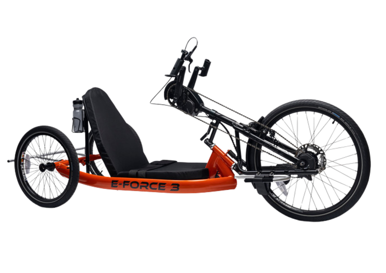 The E-Force 3 handcycle delivers a no-nonsense get-in-and-go experience with a powerful Shimano STEPS EP8 motor with autoshifting, powerboost, and up to 30 mile range.