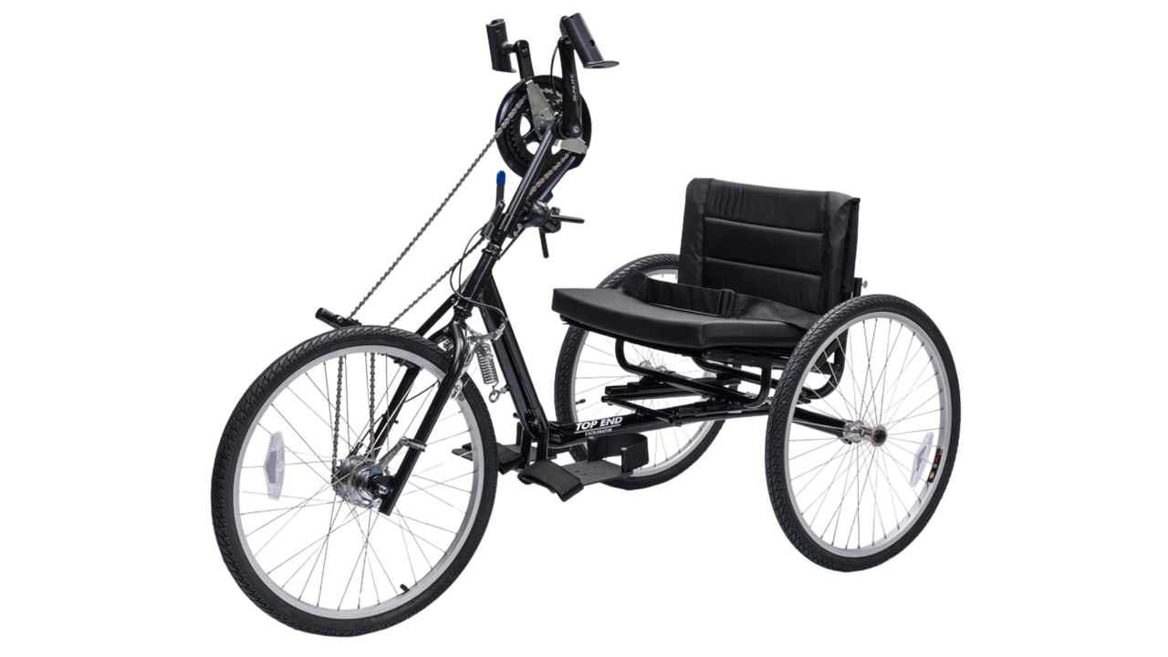 The Top End Lil' Excelerator Handcycle is also available with our optional horizontal handpedals which is preferred by younger children. Standard safety features include: reflectors, full chain guard, footrest safety straps, safety flag, cushion and seat restraint. The Top End Lil' Excelerator Handcycle is totally adjustable and ready to go.
